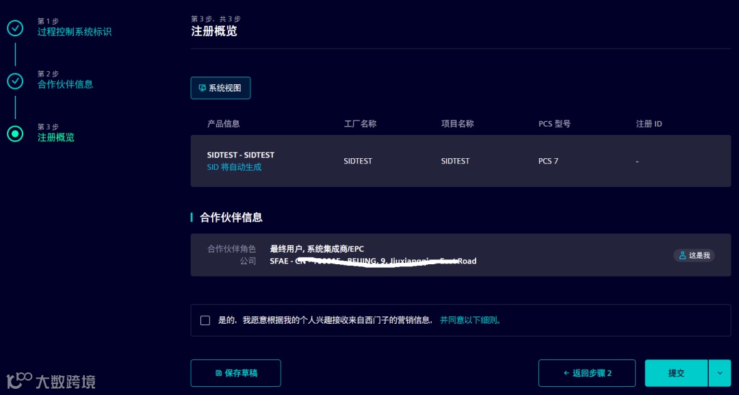 如果不是西门子邮箱登录,则当前用户为“这是我”,可用于用户自行注册 SID;如果是西门子邮箱登录的,则可以通过“添加联系人”,并勾选 “我代表这个联系人进行注册”,用于代表其他人注册 SID。