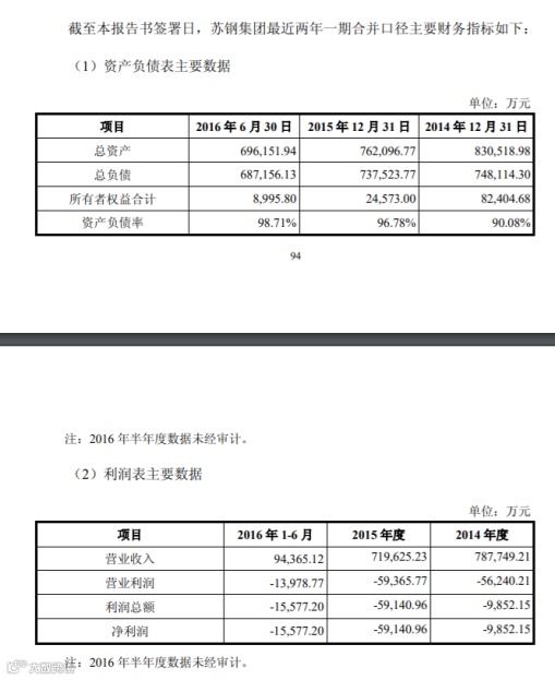 苏钢集团总资产从2014年起开始减少,资产负债率则从2014年的90.08%上升到2016年6月30日的98.71%;净亏损也在扩大,2014年度亏损9852万元,2015年度5.9亿元,2016年1-6月亏损1.56亿元。经营性现金流净额更是由正转负。如果交易顺利完成,该笔对价则相当于当时苏钢集团的总资产。