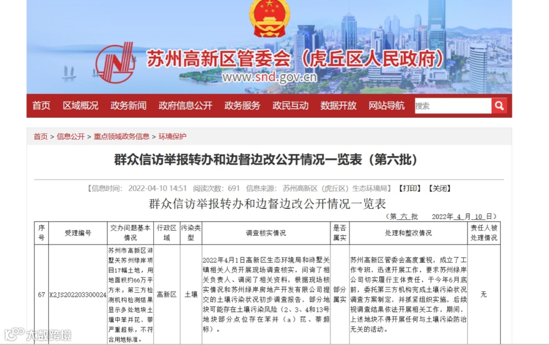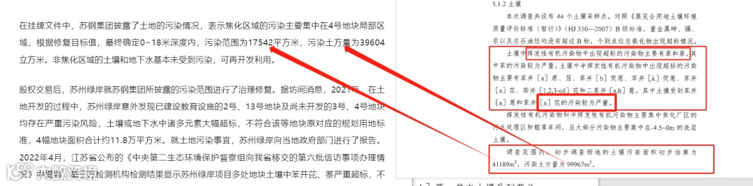 时隔6年,2022年4月,江苏省公布的《中央第二生态环境保护督察组向我省移交的第六批信访事项办理情况》中提到,第三方检测机构检测结果显示,苏州绿岸项目多处地块土壤中苯并芘、萘严重超标,不符合用地标准。