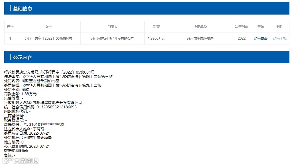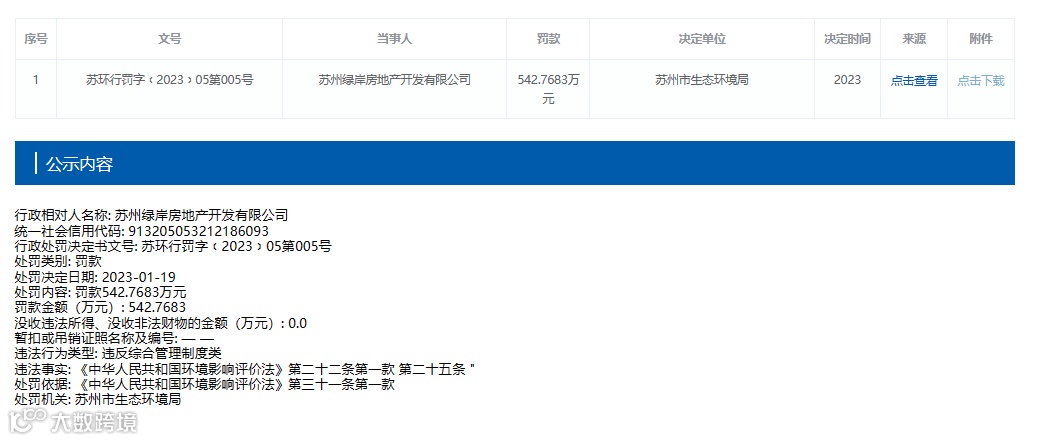 很快,2023年1月和7月,绿岸地产收到了环保部门的两张罚单,合计约545万元。
