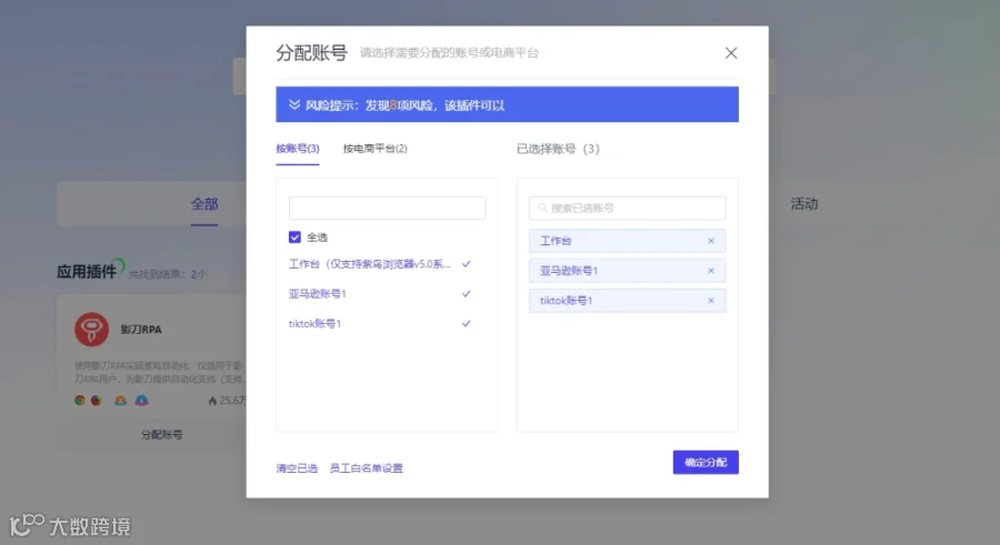 勾选账号,为需要的店铺分配插件。注意:工作台选项为紫鸟控制台窗口,可选择不勾选。