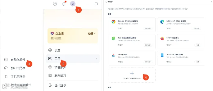 依次点击 头像 → 工具 → 自动化插件 → 添加自定义浏览器自动化 -