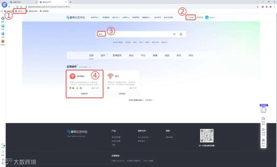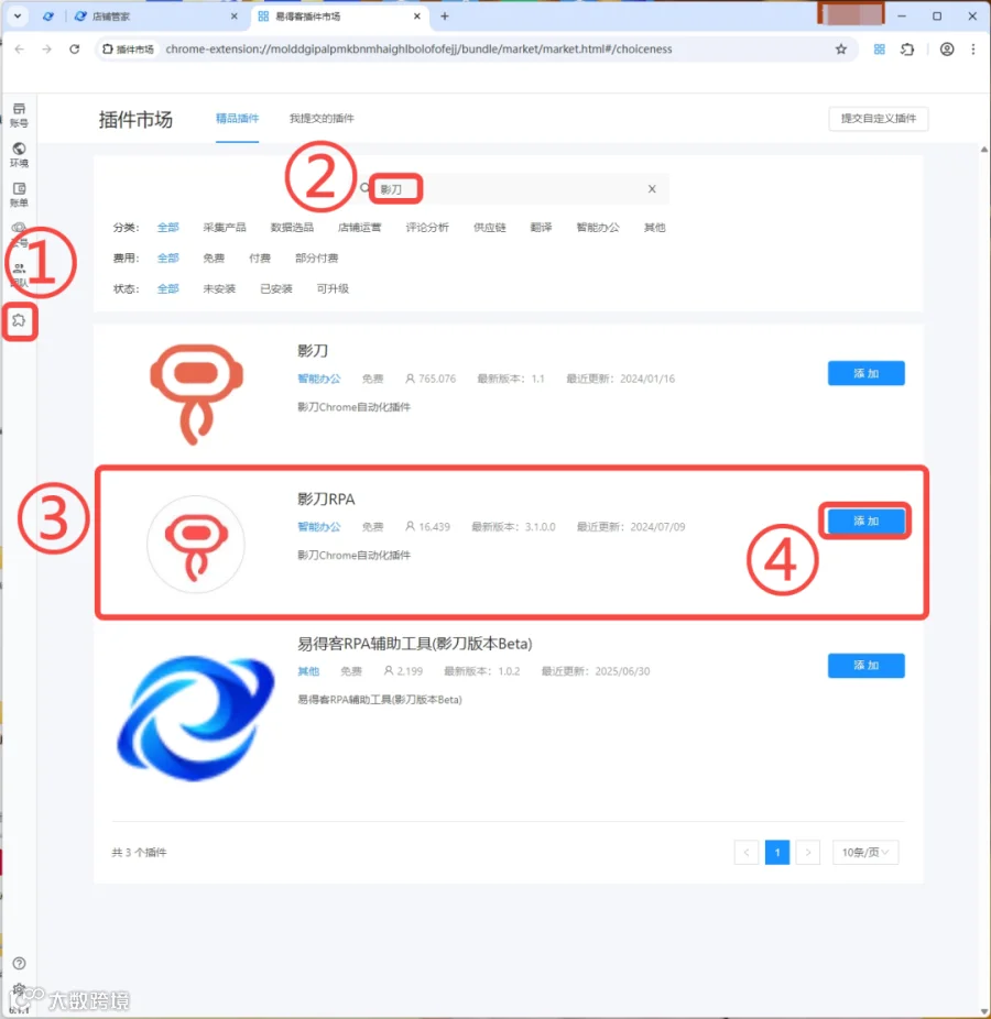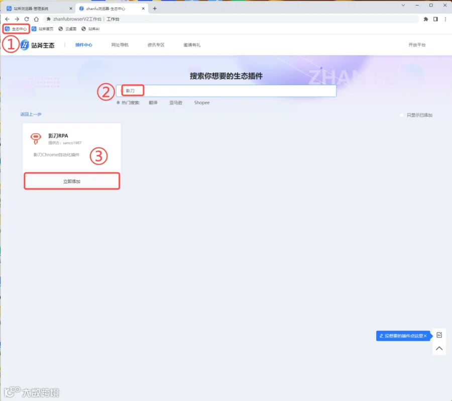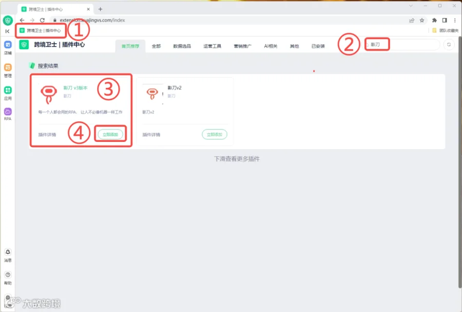 依次点击跨境卫士|插件中心→搜索影刀→立即添加