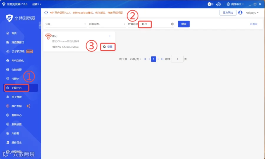 依次点击扩展中心→搜索影刀→设置