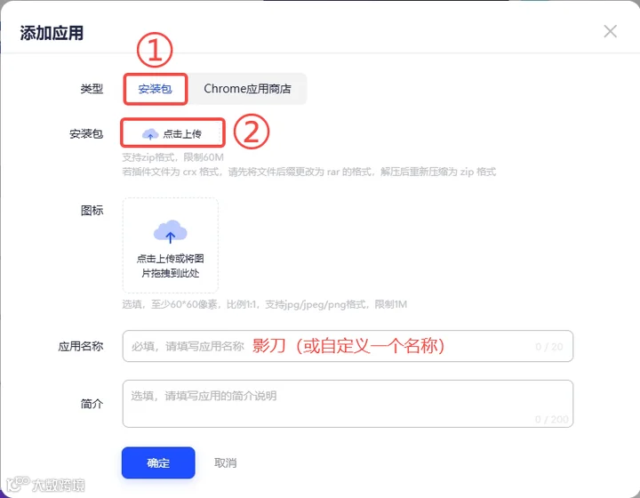 点击安装包,上传影刀插件(zip类型),填写应用名称,点击确定
