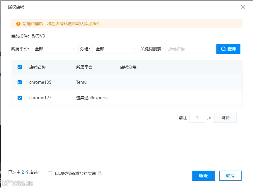 选择需要分配的店铺,点击确定 即可,建议勾选自动授权信添加的店铺