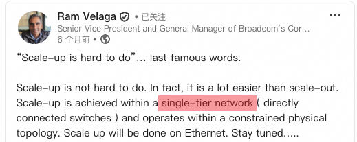 另一方面, 我们也可以看看BRCM以太网交换机BU的GM Ram Velega先生的反馈, 他也认为构建单层的交换网络即可