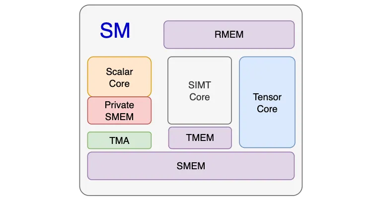 实际上这些需求本质上指向了我们需要在SM内部实现一个超标量核. 在外部SM/GPC间的NOC实现一个独立的Co-Processor会带来一个较大的问题是, 对于SMEM上的MBarrier更新通常会经历几百个cycle的交互才能被这个独立的Co-Processor处理. 而在SM内部构建, 直接可以以非常低的延迟读取SMEM, 甚至是可以让TensorCore和TMA的MBarrier更新到完全紧耦合到这个超标量核的一片Private Memory上.