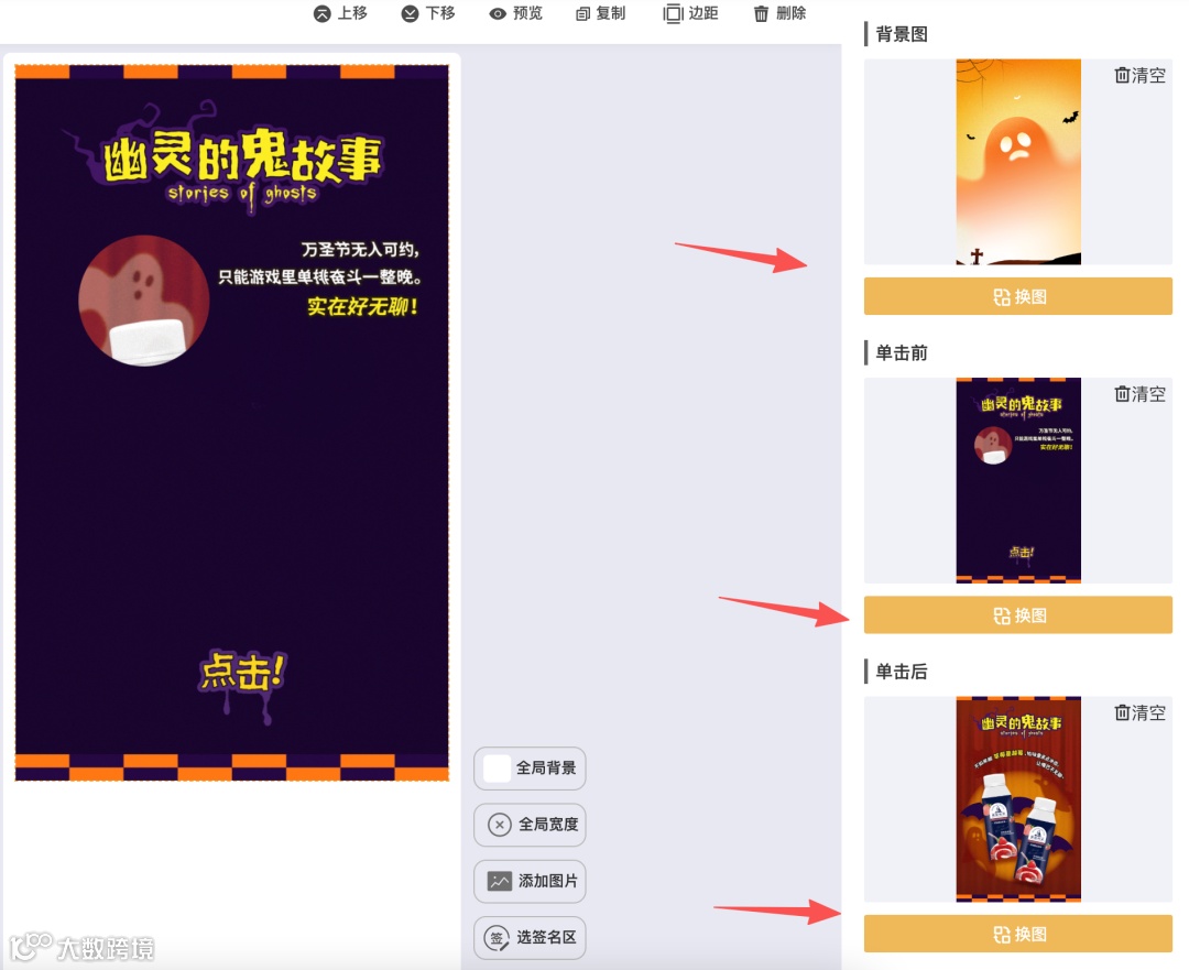 马上万圣节了,当我们在点击切换的过程中加入一个鬼脸画面,节日氛围感就更强了。点击试试: