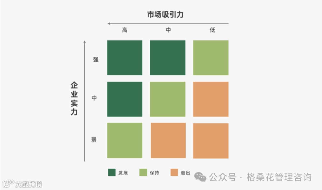 GE矩阵采用3×3九宫格形式,横轴代表“业务竞争力”,纵轴为“市场吸引力”,每项维度分为高、中、低三级,形成九个象限,对应不同的战略方向[k]
