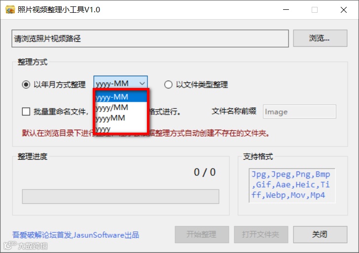 这是一款照片视频整理小工具,支持JPG、JPEG、PNG、WEBP、MOV和MP4等格式,支持以yyyy-MM年月格式分类,大小仅50KB,单文件免安装,第一步先添加文件路径。