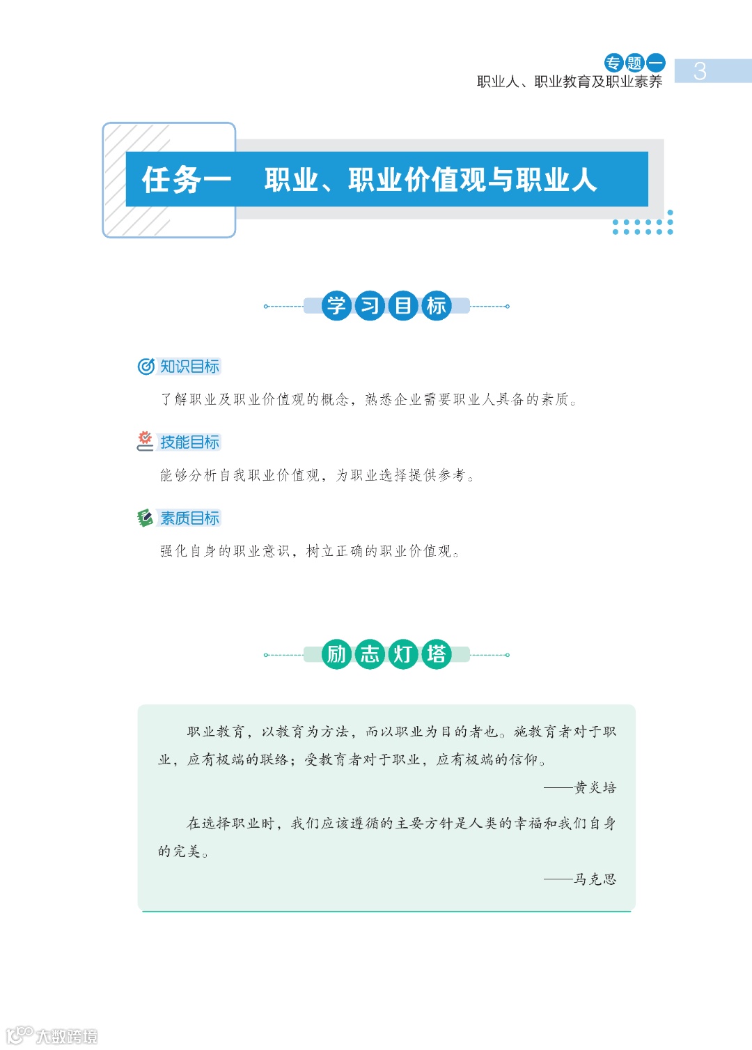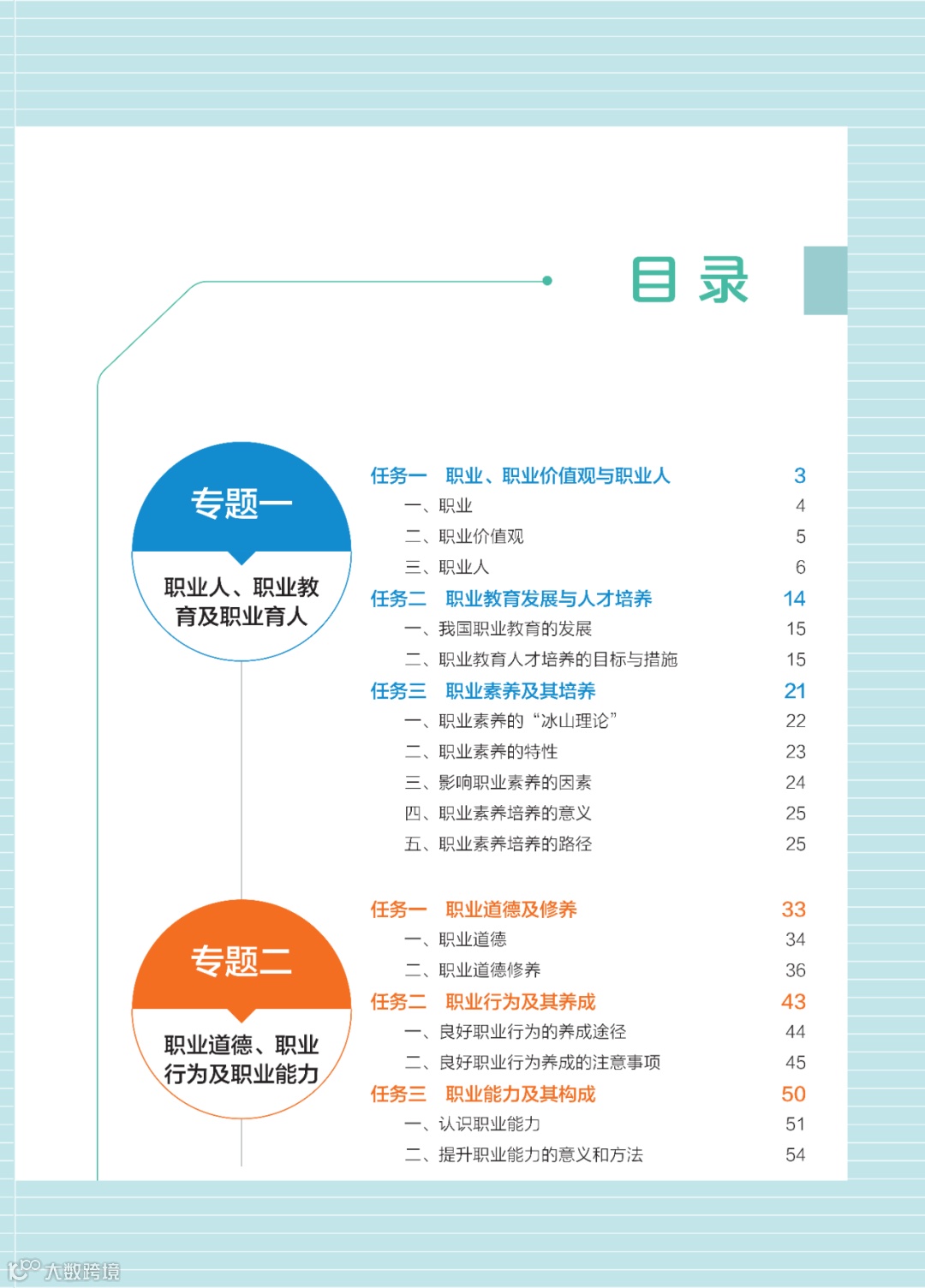 本书采用四色印刷,栏目丰富,版式精美。本书采用“项目-任务”式体例编写,活页式方式装订。每个专题设置4~6个任务细化教学内容,设置名人名言、活动拓展、案例教学、要点小结、课后实践与思考栏目,使教学环节形成闭环。
