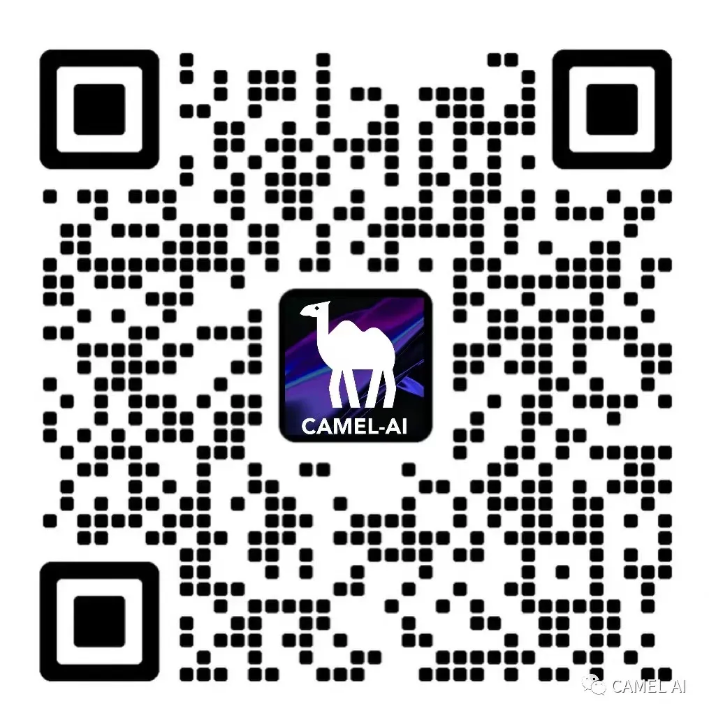 加入CAMEL微信群,请添加CAMEL官方微信号CamelAIOrg,会有工作人员通过您的好友申请并邀请您加入我们的微信群~