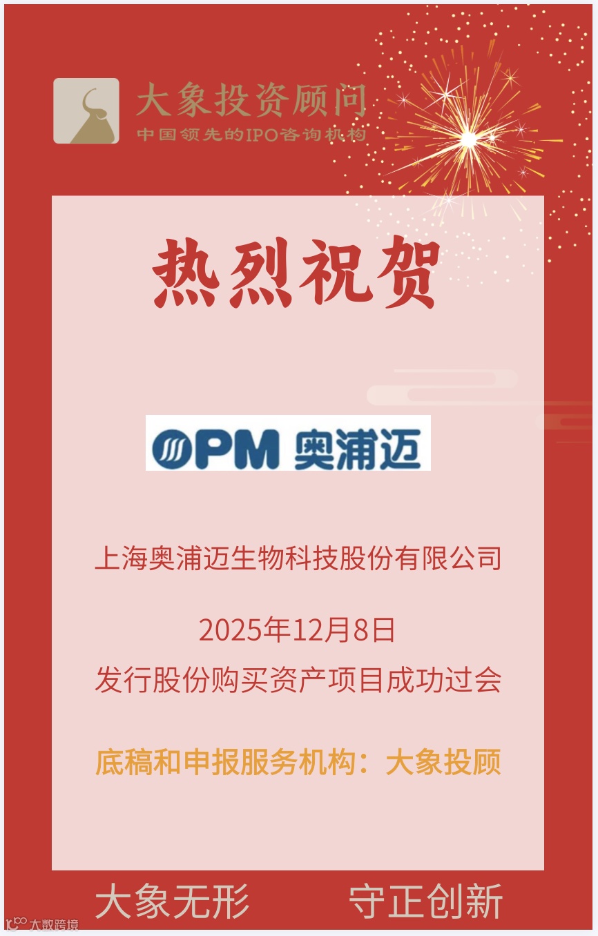 2025年12月8日,上海奥浦迈生物科技股份有限公司发行股份购买资产项目获证监会并购重组委审核通过。大象投顾担任本次重组的底稿及申报服务机构。