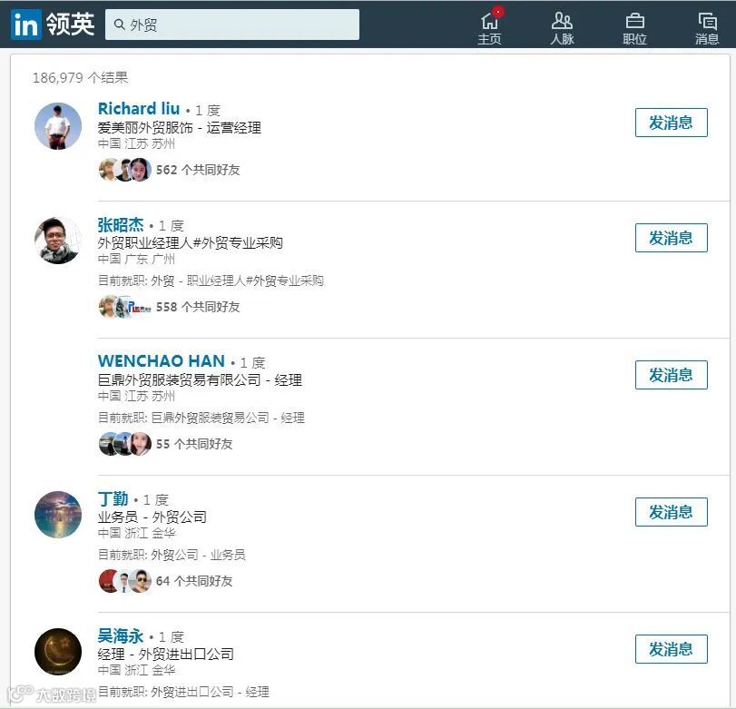 一度人脉是实现直接沟通和信息获取的基础。以关键词“LED Lighting”+“美国”为例,可搜到超11万相关用户;“外贸”+“中国”则达18万余人,显示出LinkedIn庞大的目标客户池。