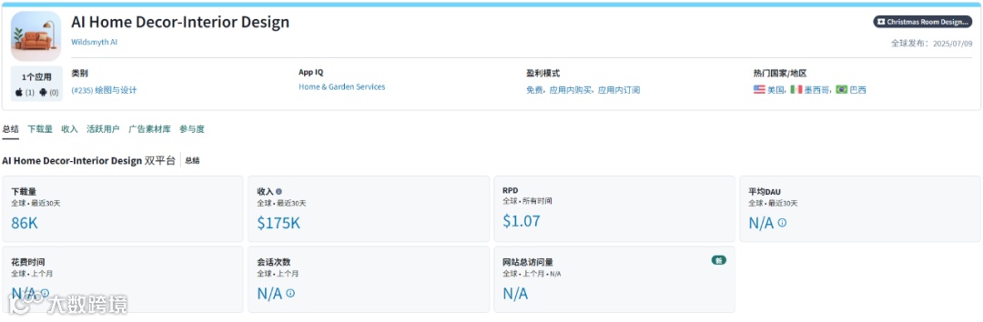 数据表现:2025年7月9日全球发布,近30天下载量8.6万次,月IAP收入17.5万美元。