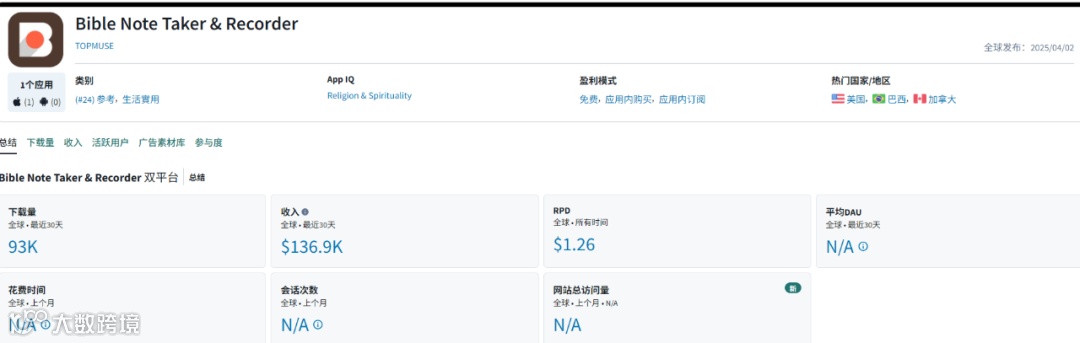 数据表现:2025年4月2日全球发布,近30天下载量9.3万次,月IAP收入13.69万美元。