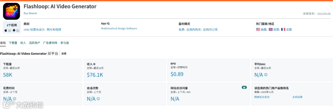 数据表现:2025年9月2日全球发布,近30天下载量7.5万次,月IAP收入5.75万美元。