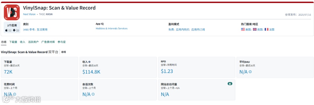 数据表现:2025年7月16日全球发布,近30天下载量7.2万次,月IAP收入11.48万美元。