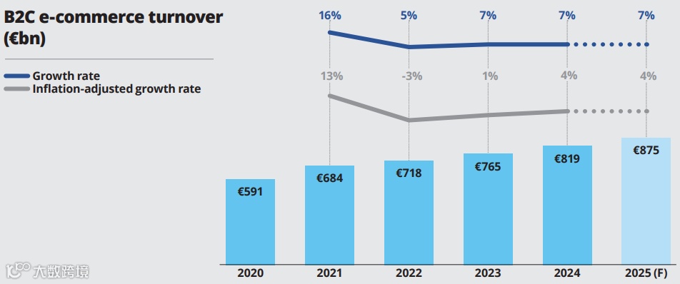 据欧洲电子商务协会预测,2025年欧洲电商市场规模将达8750亿欧元,同比增长7%;但亚马逊主导地位正被削弱[9]。