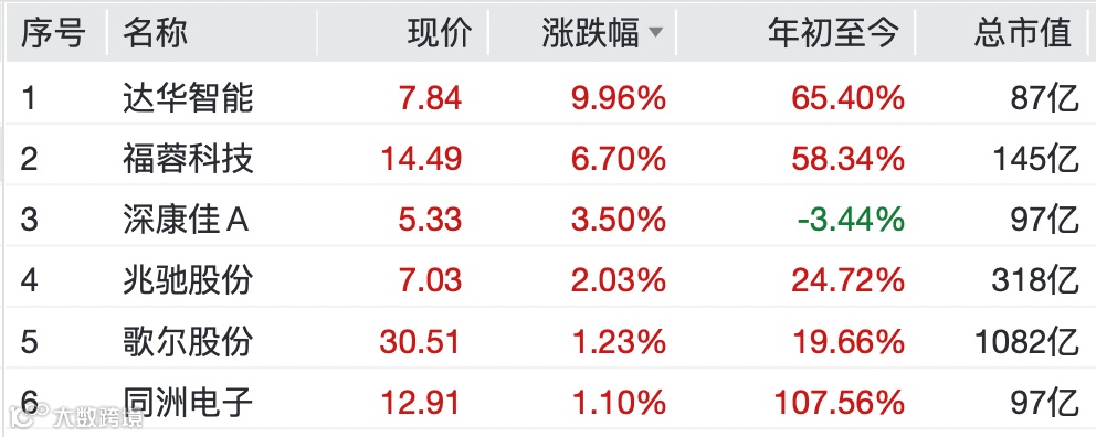 个股方面,达华智能录得10cm涨停,福蓉科技一度涨停。兆驰股份、深康佳A、同洲电子、歌尔股份等跟涨。