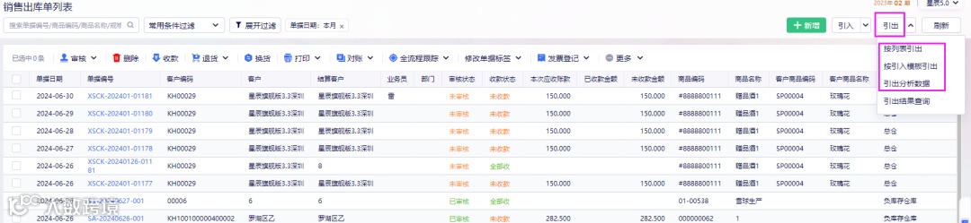 点击右上角<引出>,可选择[按列表引出]、[按引入模板引出]、[引出分析数据]。