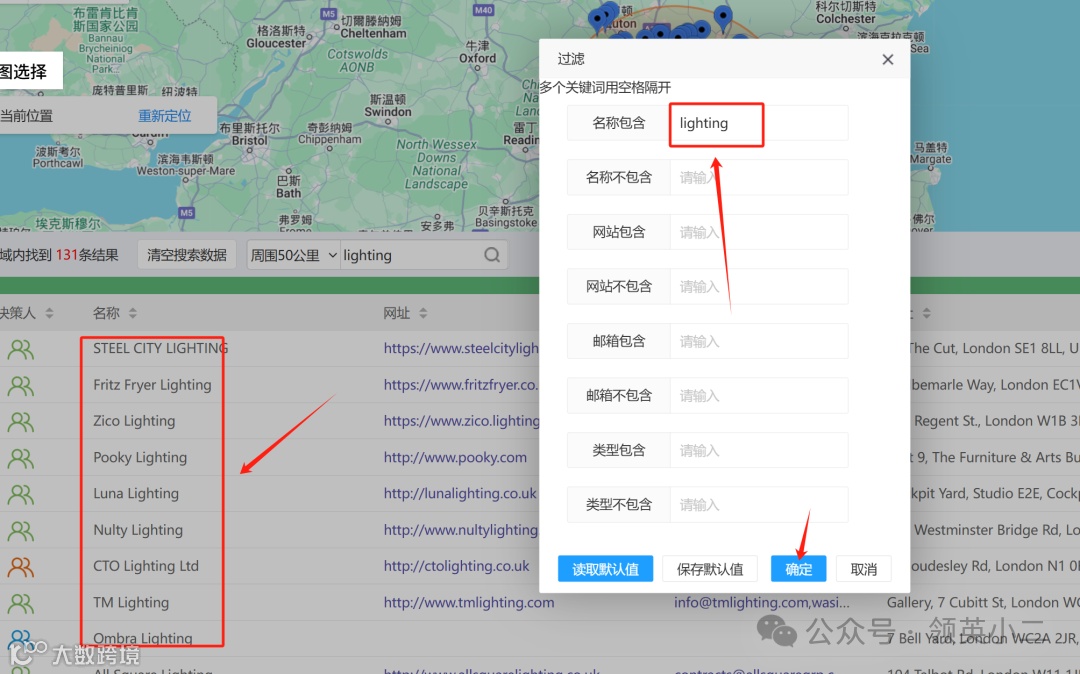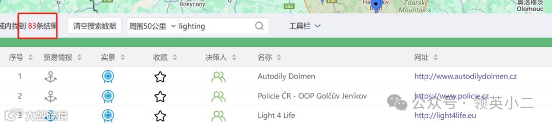 利用工具栏「过滤」功能(如限定公司名含 “lighting”),可将初始结果从 174 家精简至 131 家,大幅提升筛选效率[10]。