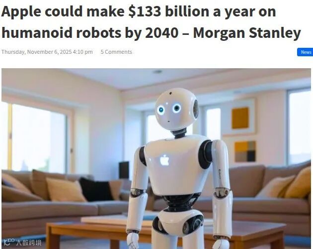 摩根士丹利预测,若苹果占据9%市场份额,到2040年每年可从中获得1330亿美元收入。