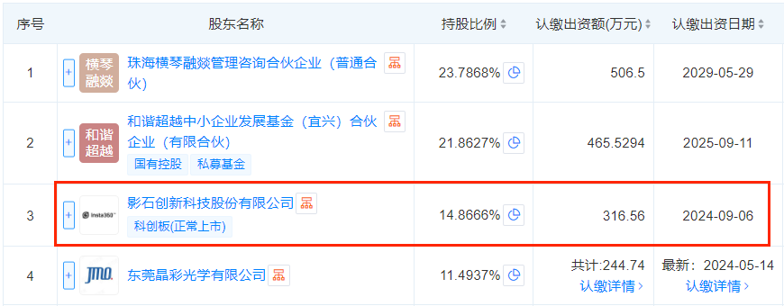 其中影石创新100%持股的一路高飞(深圳)科技有限公司对影微创新首次持股日期显示是2025年11月21日,持股比例约为0.66%。