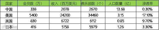 据THE IHRSA Glboal Report 2015的统计数据可以看出,与美国、英国、日本等发达国家相比,中国在会员数、俱乐部数量和客单消费方面都有较大提升空间。从人口渗透率上看,中国不足1%,而美国却已达到17.1%。