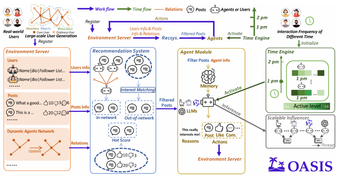 我们的工作流程概述图如下。我们在论文中详细介绍了OASIS的核心模块,并成功复现了一些真实的社会现象论文原文请看: