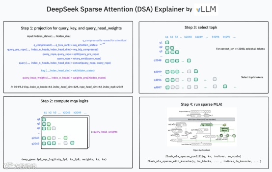 传统大模型处理长文本时面临计算复杂度O(L²)的瓶颈,导致128K上下文推理成本高昂。DeepSeek提出DSA(DeepSeek Sparse Attention)稀疏注意力机制,通过“闪电索引器”与“细粒度token选择”,将复杂度降至O(L·k),显著提升效率。