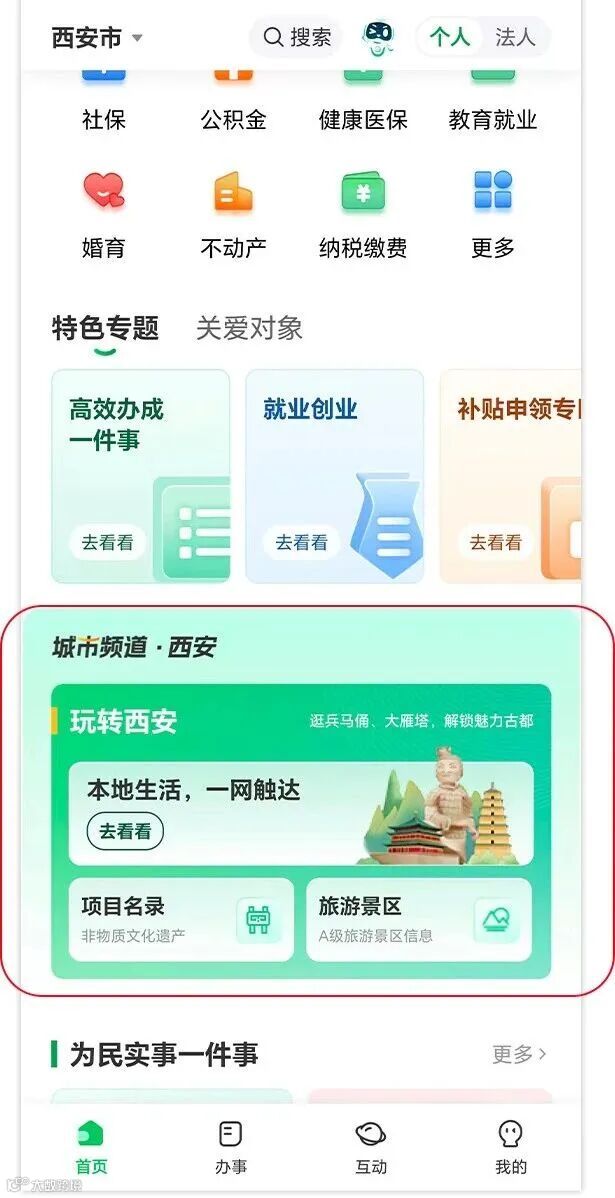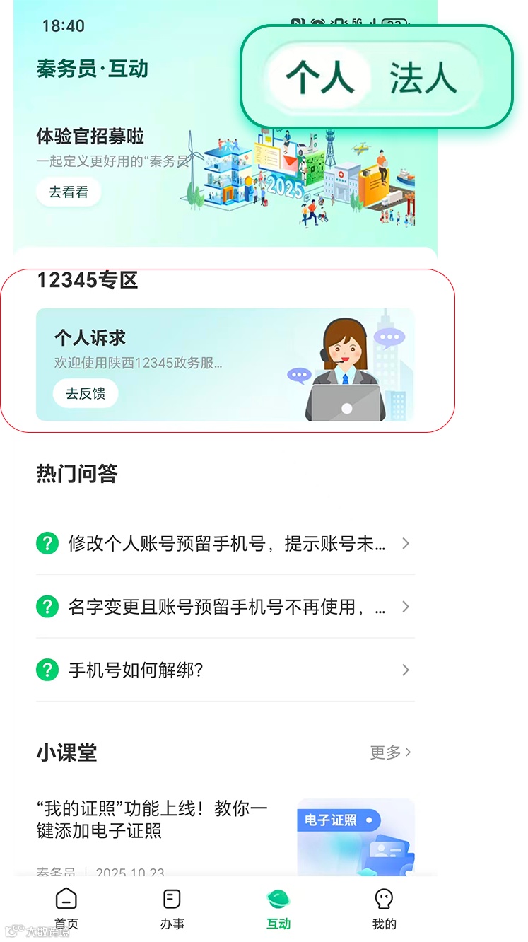 在首页、办事、互动页面右上角点击【个人/法人】,可切换身份查看或办理不同业务。