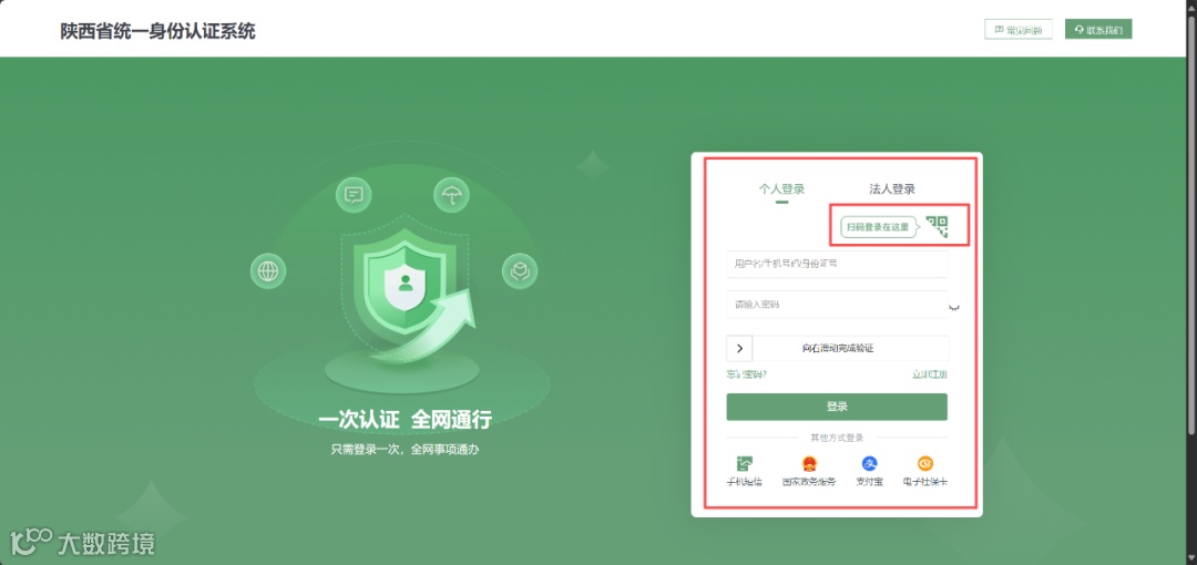 支持账号密码、验证码、国家政务服务平台账号等登录方式,也可使用“秦务员”APP【扫一扫】扫码登录。