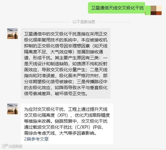 例如,在公众号主页输入“卫星通信天线的交叉极化干扰”,系统迅速作出回应。回复内容出自知识库中的某篇文章,并贴心地提供了来源链接,方便用户进一步查阅。
