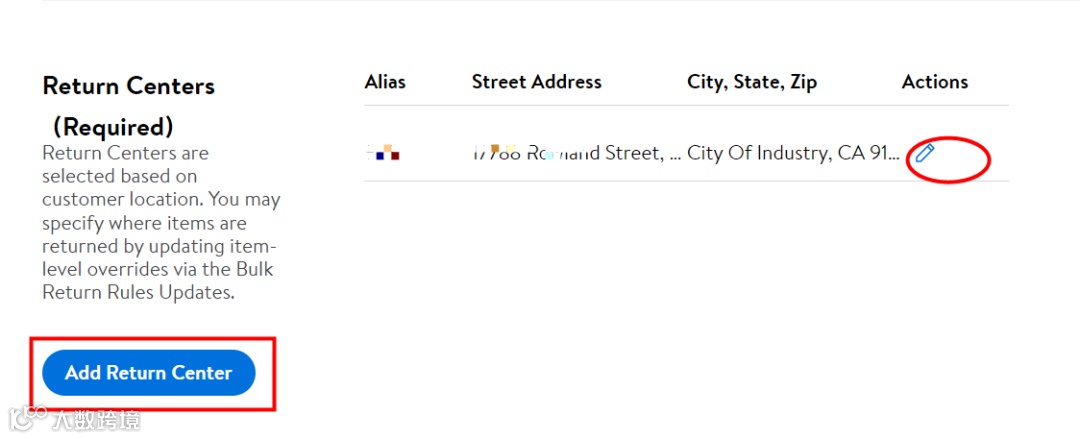 沃尔玛可以设置多个退货地址,可用来的用作AGL、赛盈等分销平台的产品退货地址,然后覆盖店铺中相应的分销产品SKU,覆盖到对应的海外仓地址,可减少一定的麻烦。如图点击add return center,即可添加新的退货中心地址,点击✏的位置,即可修改相应的退货中心的地址信息