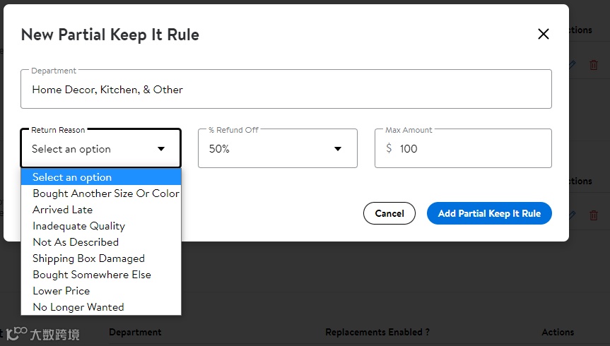选择 Add Partial Keep It Rules,Department选择想要参加的品类,Return Reason选择自身退货原因频率较高的原因,% Refund Off