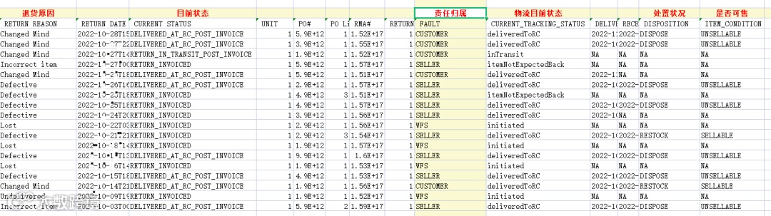 下载WFS return reports, 可根据报表得出 退货订单的退货时间、退货状态、物流状态、是否可售、退货责任归属、退货产品后续处置状态等,WFS退货订单责任归属为WFS的订单,沃尔玛承担退货运费,卖家无需承担退货运费。WFS退货原因是Lost After Delivery、Lost In Transit、Return To Sender、Incorrect Item等WFS责任引起顾客退货,卖家不需要承担退款(具体订单以payment明细为准)