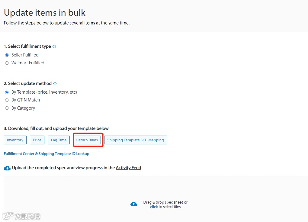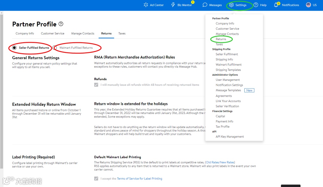 Setting-Return-Seller Fulfilled Returns/Walmart Fulfilled Returns,即可对自发货配送/WFS配送产品进行退货设置;