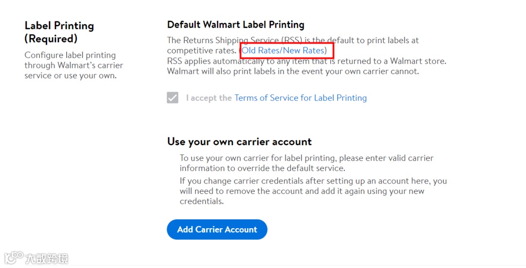 退货标签可以选择沃尔玛默认的退货标签打印服务(RSS),或者选择Add Carrier Account,可添加公司或者自己拥有的FedEx或者UPS账号,可根据退货运费等实际情况选择自行添加;退货运费可点击(Old Rates/New Rates)获取报价(如下图)