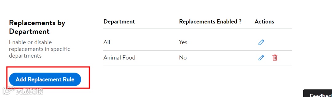 Replacements Rules可根据类目进行设置退换货设置,选择相应的类目Department,Replacements Enabled结合实际情况去设置,符合类目条件的顾客即可以选择沃尔玛提供的退换货服务;
