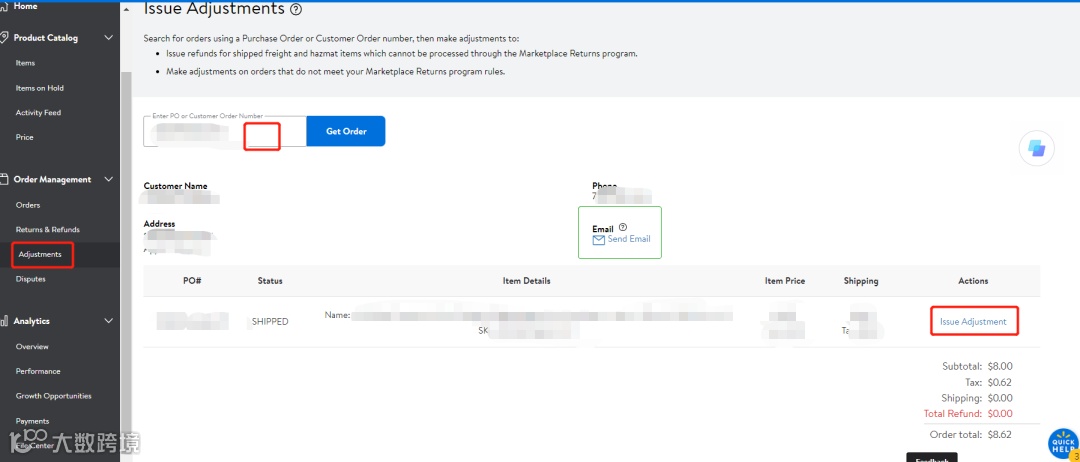 卖家若想主动给与顾客退款,或者部分退款,可通过Adjustment功能去主动发起;操作方法为:点击Adjustments,输入订单PO号或者Order Number,确认后,选择Issue Adjustment,选择全部退款或者部分退款(固定数额或者比例),以及合适的退款理由即可完成退款,事后可发站内信通知顾客;