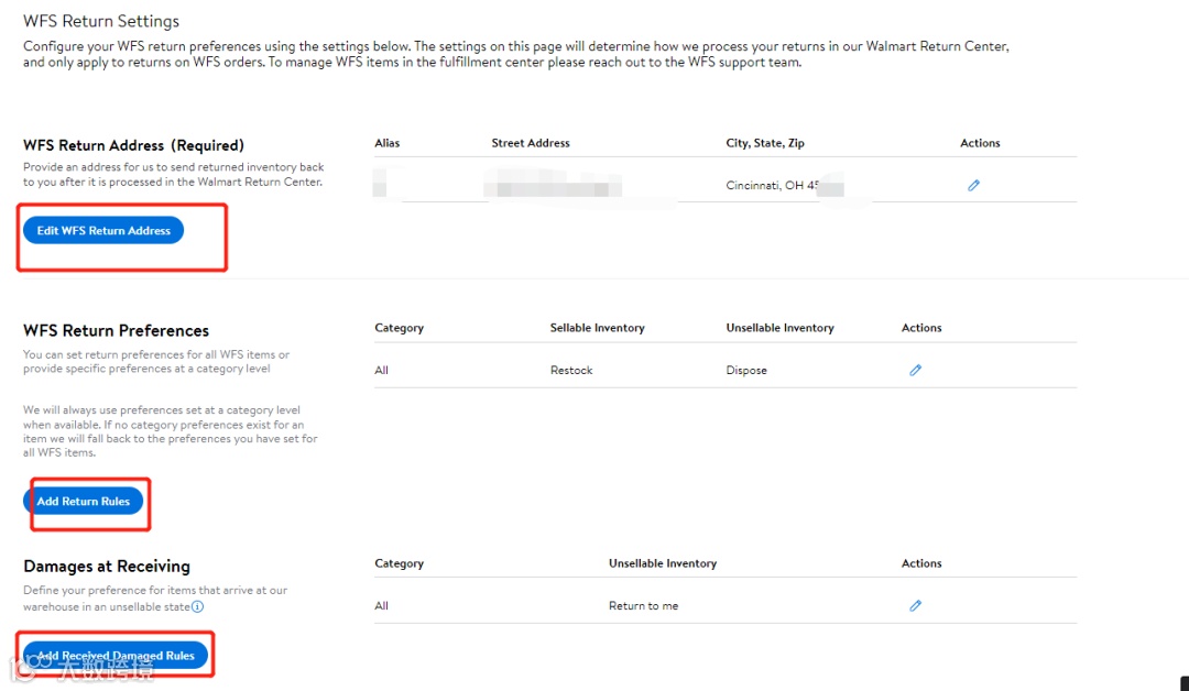 相比较Seller Fulfilled Returns规则设置,Walmart Fulfilled Returns则较为简单,以下为沃尔玛配送退货规则截图,可以设置退货中心地址,WFS Return Preferences 可设置WFS退货产品可售、不可售产品的处理方式;Damages at Receiving WFS接受货物时产品损坏时WFS退货中心的处理方式。