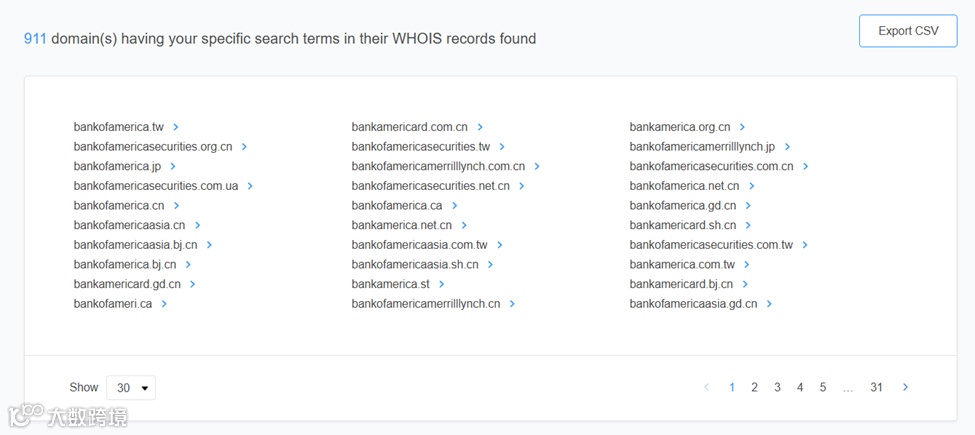 Alt: “bank”开头+注册邮件domain.administrator@bankofamerica.com使用反向WHOIS查询的结果(使用 WhoisXML API的域名查询服务 Domain Research Suite)