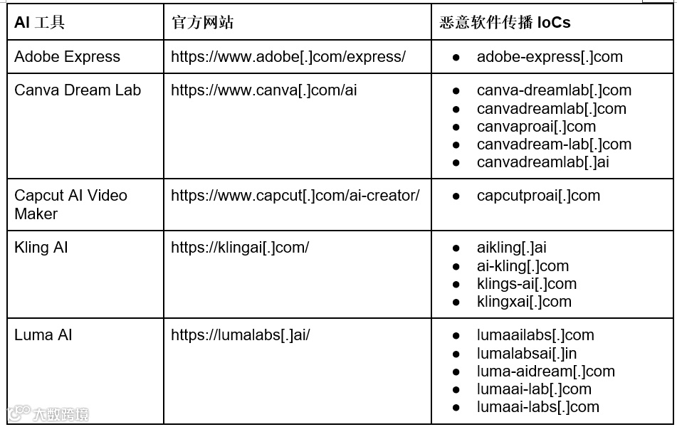 仿冒域名也常被用于诱骗用户在不知情的情况下下载恶意软件。Mandiant 的威胁情报报告中提到,一个名为 “UNC6032” 的攻击组织曾利用多款 AI 生成式内容工具的官方域名变体,伪装成正版网站,向用户传播窃密类恶意软件(information-stealing malware)。