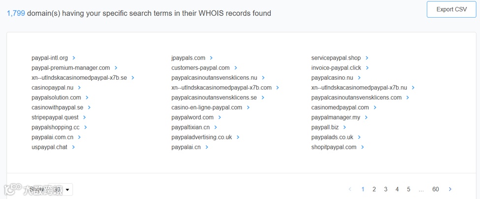 使用反向WHOIS查询并按照以上条件设定,共返回1799个与PayPal相似的仿冒域名。