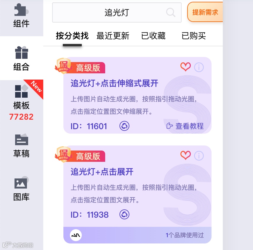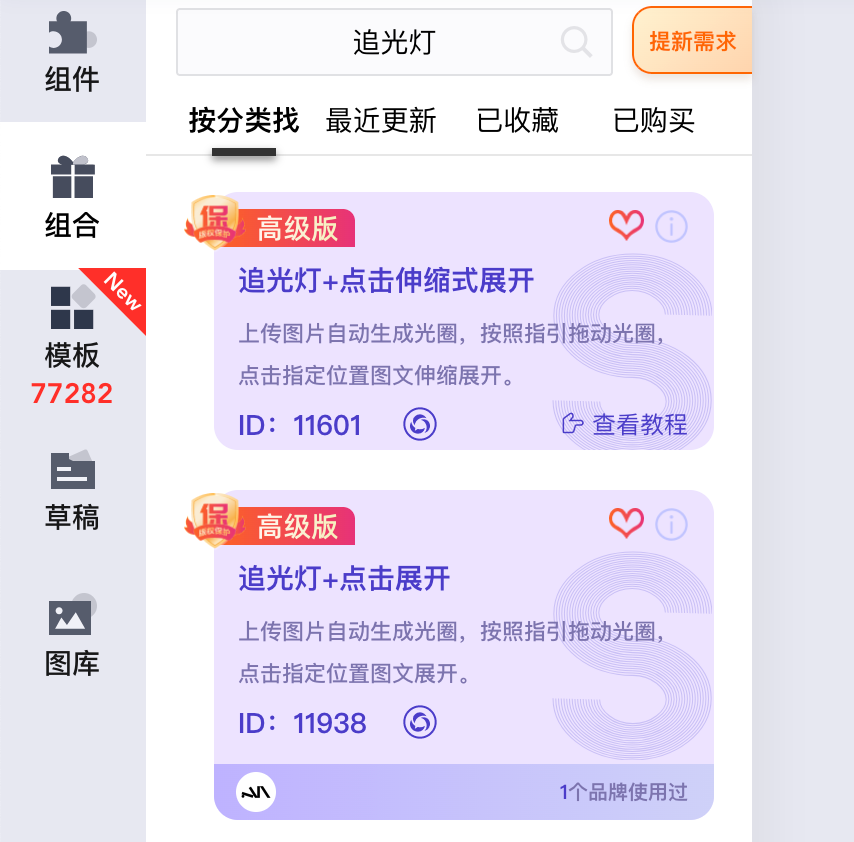 登录 iPaiban Pro 黑科技编辑器后,点击编辑器左侧「组合」按钮,在「花样展开」分类中找到「追光灯+点击伸缩式展开」组合,或者在组合中直接搜索编号11601,点击选择。