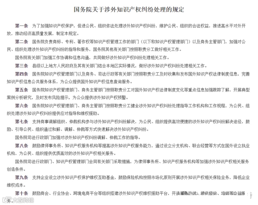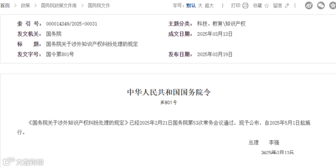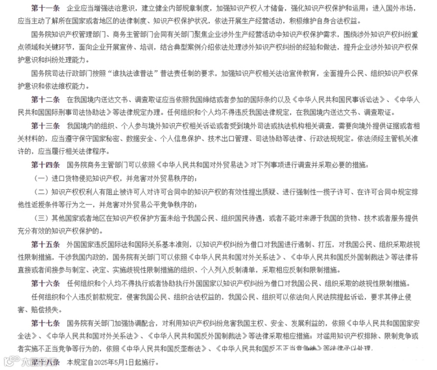 2025年3月19日,国务院正式发布了《涉外知识产权纠纷处理规定》,并将于2025年5月1日起正式实施。