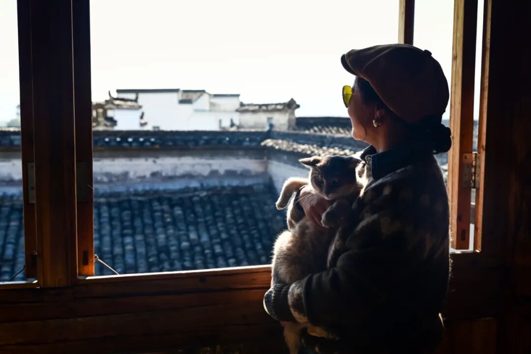 一面素净的白墙与徽派民居,被岁月磨洗出温润的灰度。秋光侧过,墙便成了一张巨大的宣纸。
