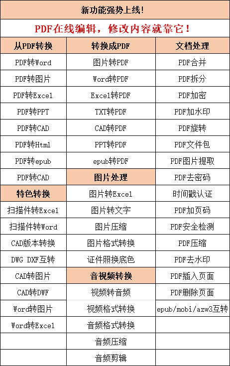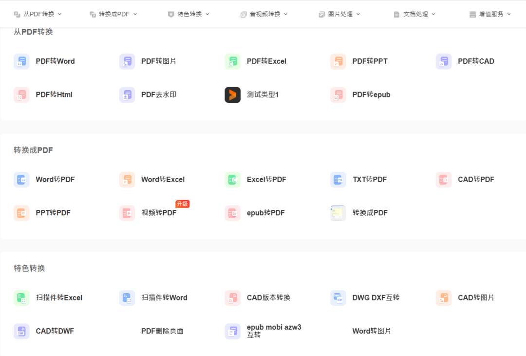 除支持PDF文档处理外,也支持其他文档格式处理,如:电子书转换处理,图片转换压缩处理,视频转文字等,具体功能如下所示:
